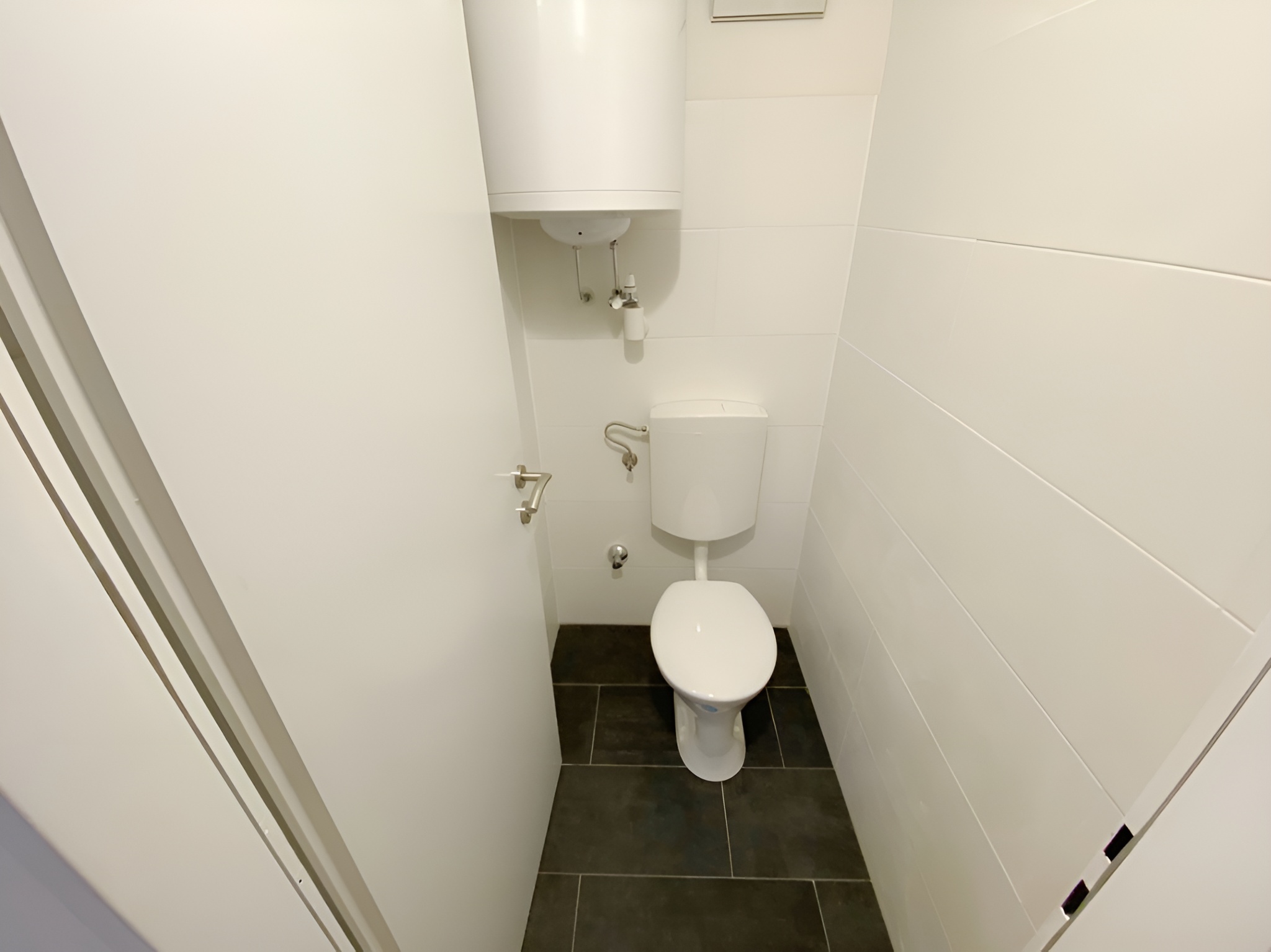 Badezimmer und WC sind mit zeitlosen, dunklen Bodenfliesen und weißen Wandfliesen ausgestattet; im Bad ist zudem ein praktischer Handtuchwärmer montiert. Der Heißwasserboiler befindet sich im WC.
